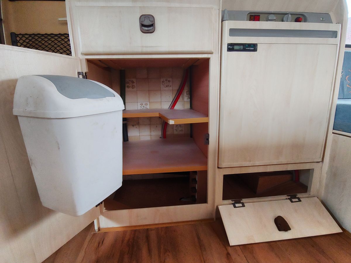 Küchenschrank mit Abfalleimer, Kühlschrank und Staufach